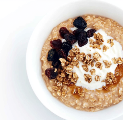 - Matin : Porridge (70 g avoine, lait poudre, fruits secs, miel)